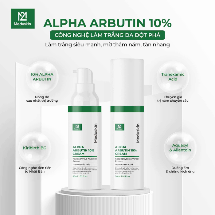 Bạn đang tìm kiếm một giải pháp làm trắng da mạnh mẽ, an toàn và hiệu quả? Kem dưỡng Meduskin Alpha Arbutin 10% chính là lựa chọn đột phá, giúp làm sáng da, mờ thâm nám, tàn nhang, đồng thời nuôi dưỡng và phục hồi da từ sâu bên trong. Với nồng độ Alpha Arbutin cao nhất thị trường, sản phẩm mang đến hiệu quả nhanh chóng và bền vững.