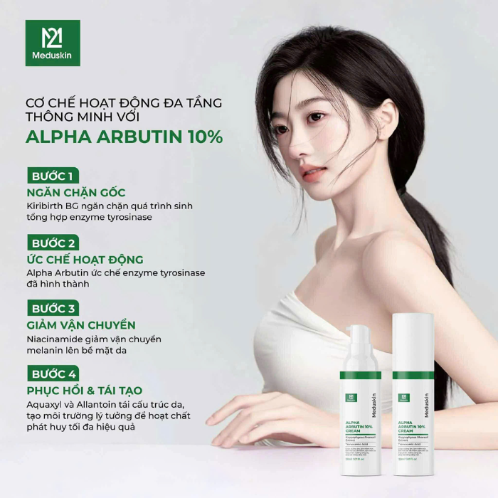 - Alpha Arbutin 10%: Ức chế enzyme tyrosinase, ngăn ngừa hình thành melanin.