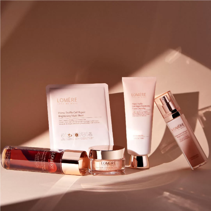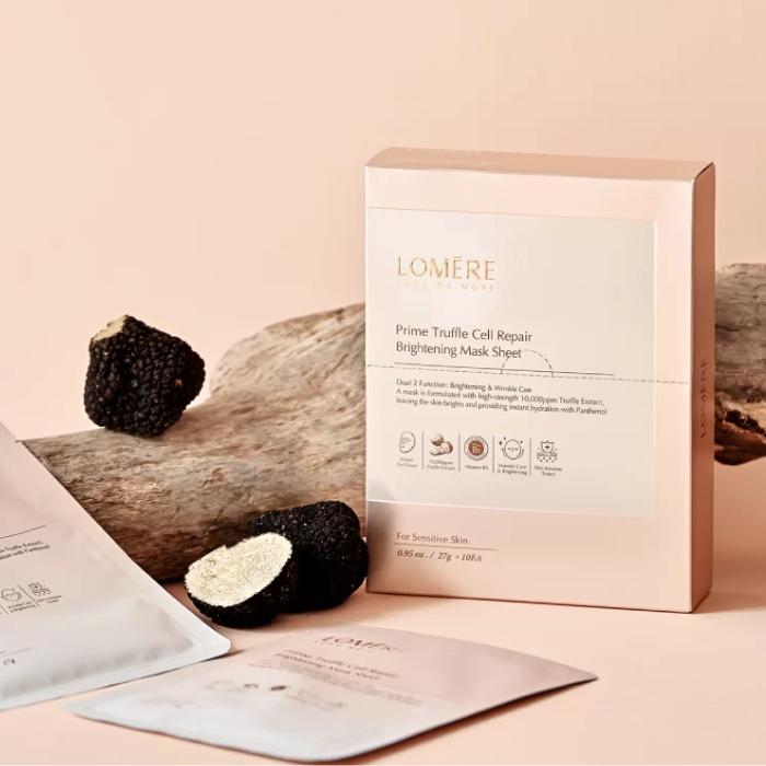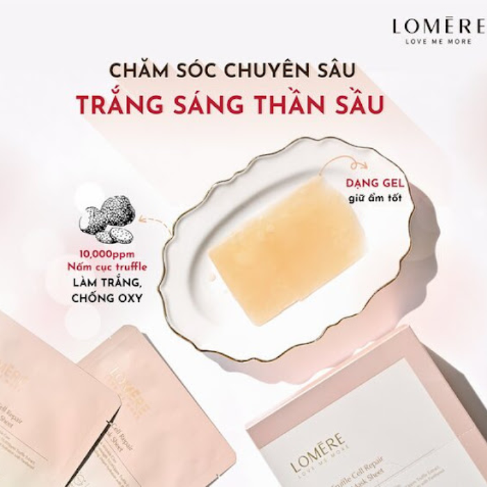 Mặt nạ dưỡng trắng, phục hồi da Lomere Prime Truffle Cell Repair Brightening Mask Sheet được sản xuất bằng công nghệ hoàn toàn mới water gel giúp chứa nhiều dưỡng chất chăm sóc da và cấp ẩm gấp 3 lần mặt nạ giấy thông thường từ đó giúp cấp ẩm sâu và làm dịu da tức thì. Ngoài ra sản phẩm có chứa thành phần nấm cục Truffle, Niacinamide, Vitamin C giúp mang lại hiệu quả làm sáng da, dưỡng ẩm hỗ trợ thải độc da, phục hồi da đang bị tổn thương một cách tức thì.