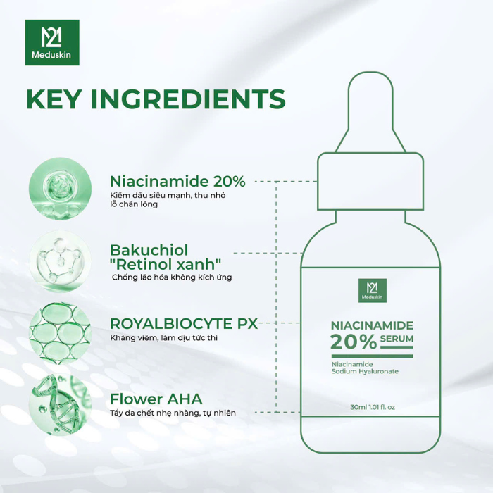 - Niacinamide 20%: Nồng độ cao nhất thị trường, kiểm dầu siêu mạnh, se khít lỗ chân lông.