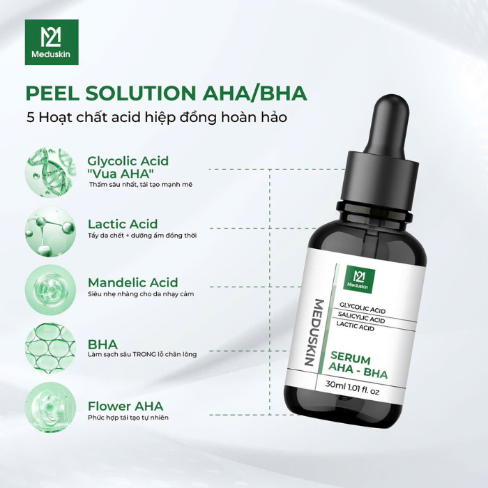 Da xỉn màu, bít tắc lỗ chân lông và sần sùi luôn khiến bạn mất tự tin? Serum Peel Solution AHA/BHA Meduskin với hệ thống acid đa tầng thông minh sẽ là “trợ thủ” giúp da sạch sâu, sáng mịn và khỏe mạnh hơn mỗi ngày.