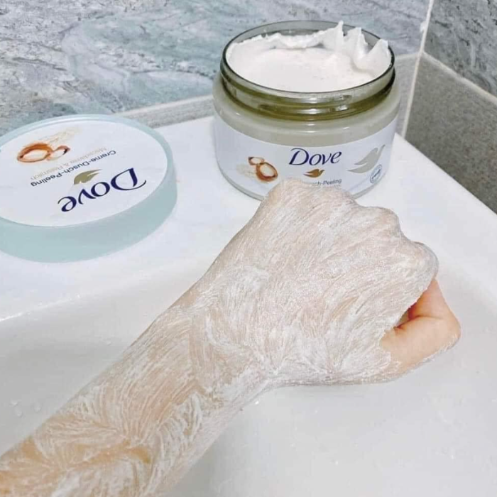 - Bước 2: Lấy một lượng vừa đủ kem Tẩy tế bào chết body toàn thân Dove – Macca rồi thoa lên cơ thể.