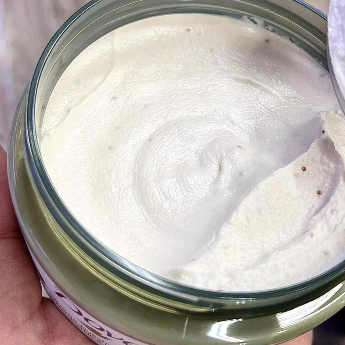 - Công thức với ¼ kem dưỡng ẩm giúp nuôi dưỡng sâu cho da mềm mượt, mịn màng sau khi tẩy da chết.